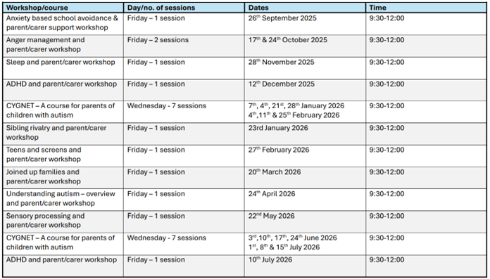 Any safeguarding concerns, neurodiversity or other more complex and risky behaviours, that arise through observed therapeutic or direct family support sessions, or groupwork interventions, will be offered as supporting evidence to supplement requests for specialist support, or to escalate concerns to Family Hubs or CSWS, for specialist support. The cluster also run courses throughout the year to support families. A list of course dates can be found in the table below. Please contact Mrs Oliver should you need any more information or help booking a place.